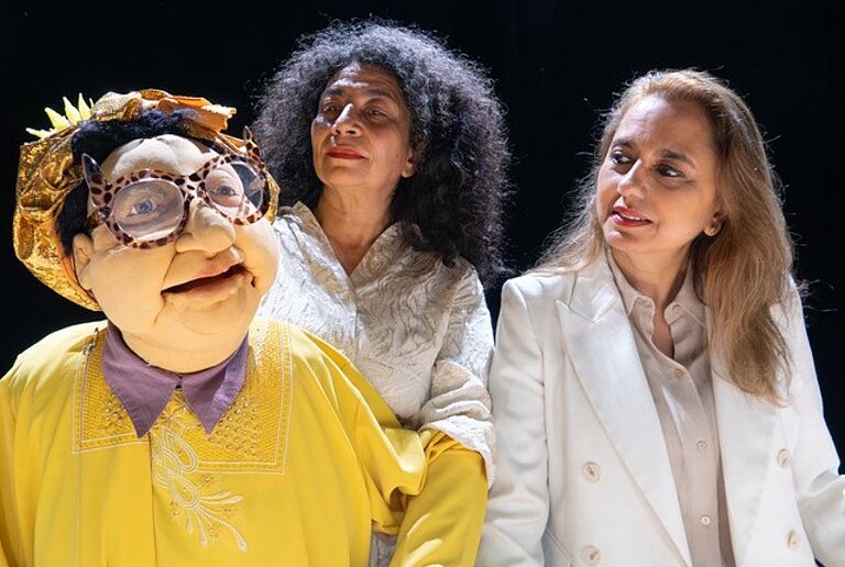 Durch den Theaterabend führt die lebensgrosse Puppe Maria Gonzalez gemeinsam mit ihrer Assistentin Frida Léon Beraud und der Pflegeexpertin Milena Petrovic.