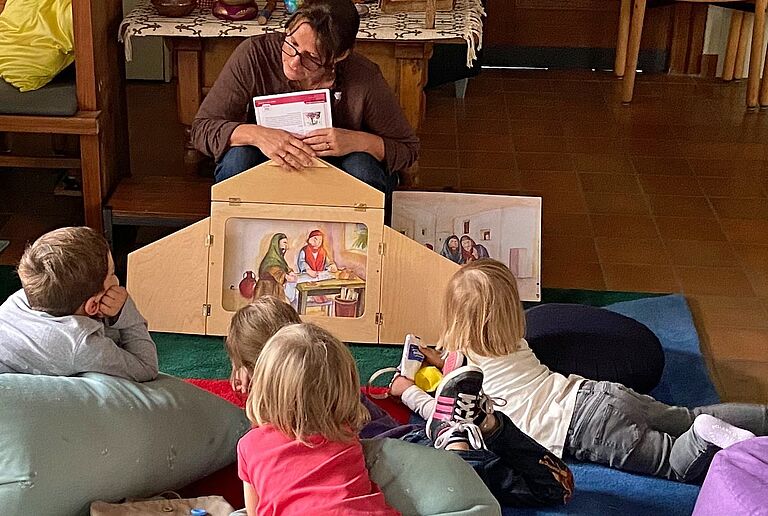 Wir beten, singen und tanzen gemeinsam und hören eine biblische Geschichte. Nachher teilen wir miteinander ein Znüni, trinken Tee oder Kaffee, basteln etwas zum Thema, plaudern und spielen gemeinsam. Die Feier ist auf Kinder von 0 - 6 Jahren zugeschnitten. Gut tut sie uns allen.