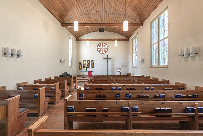 Unsere Kirche hat maximal 150 Sitzplätze und steht für kirchliche Feiern oder Konzerte zur Verfügung. Sie verfügt über einen Beamer, eine Tonanlage sowie eine Ringleitung für Hörgeräte.