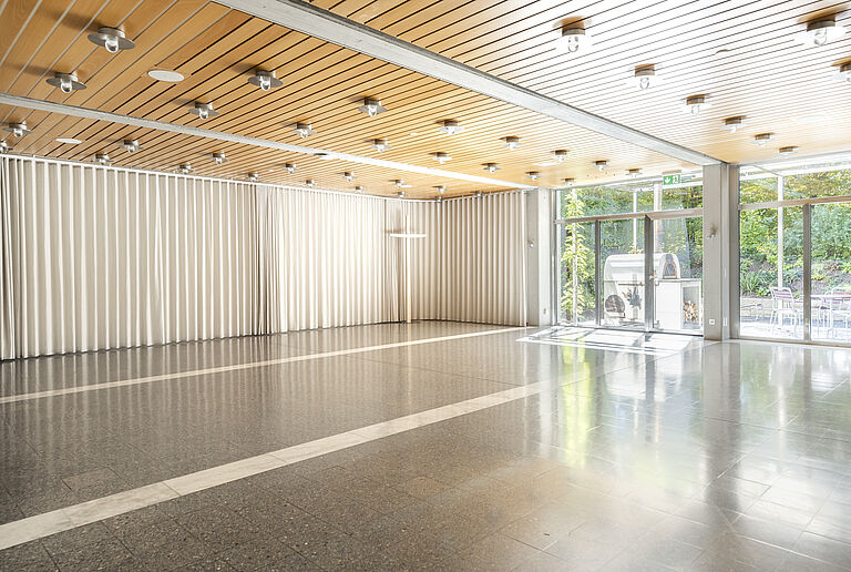 Der lichtdurchflutete Saal eignet sich für Versammlungen, Vorträge oder Workshops, Feiern, Konzerte und vieles mehr. Durch verschiebbare Wandelemente kann er mit dem Foyer und dem Atrium nach Bedarf vergrössert werden. Der Saal verfügt über eine integrierte Musikanlage und grenzt direkt an den Garten, mit Seesicht.