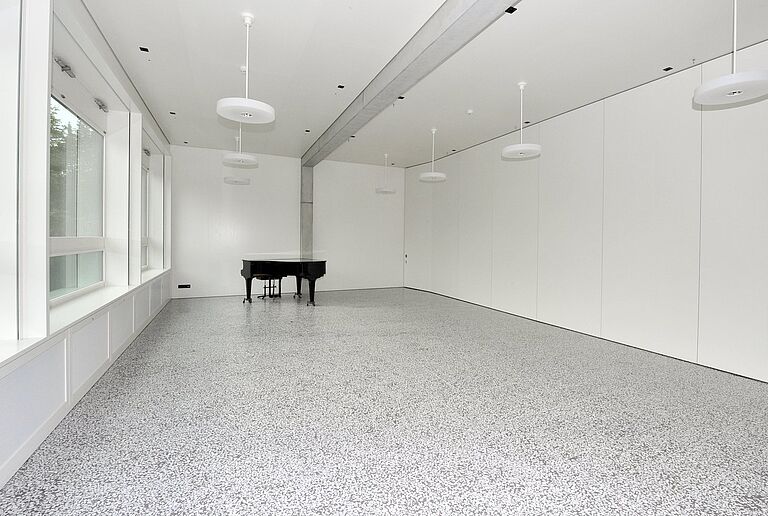 - Grösse 77 m², 11 x 7 m; Erdgeschoss, Trennwand, grosse Fensterfront, Seesicht